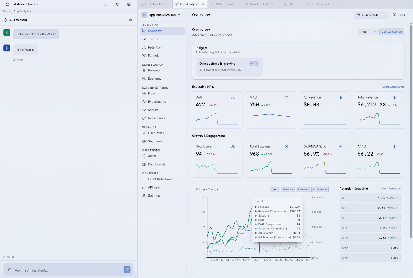 AI-native live ops solution with integrated CMS + Analytics + Webshops — keeping developers in real time, behind firewalls and leveraging infrastructure, all from one dashboard.
